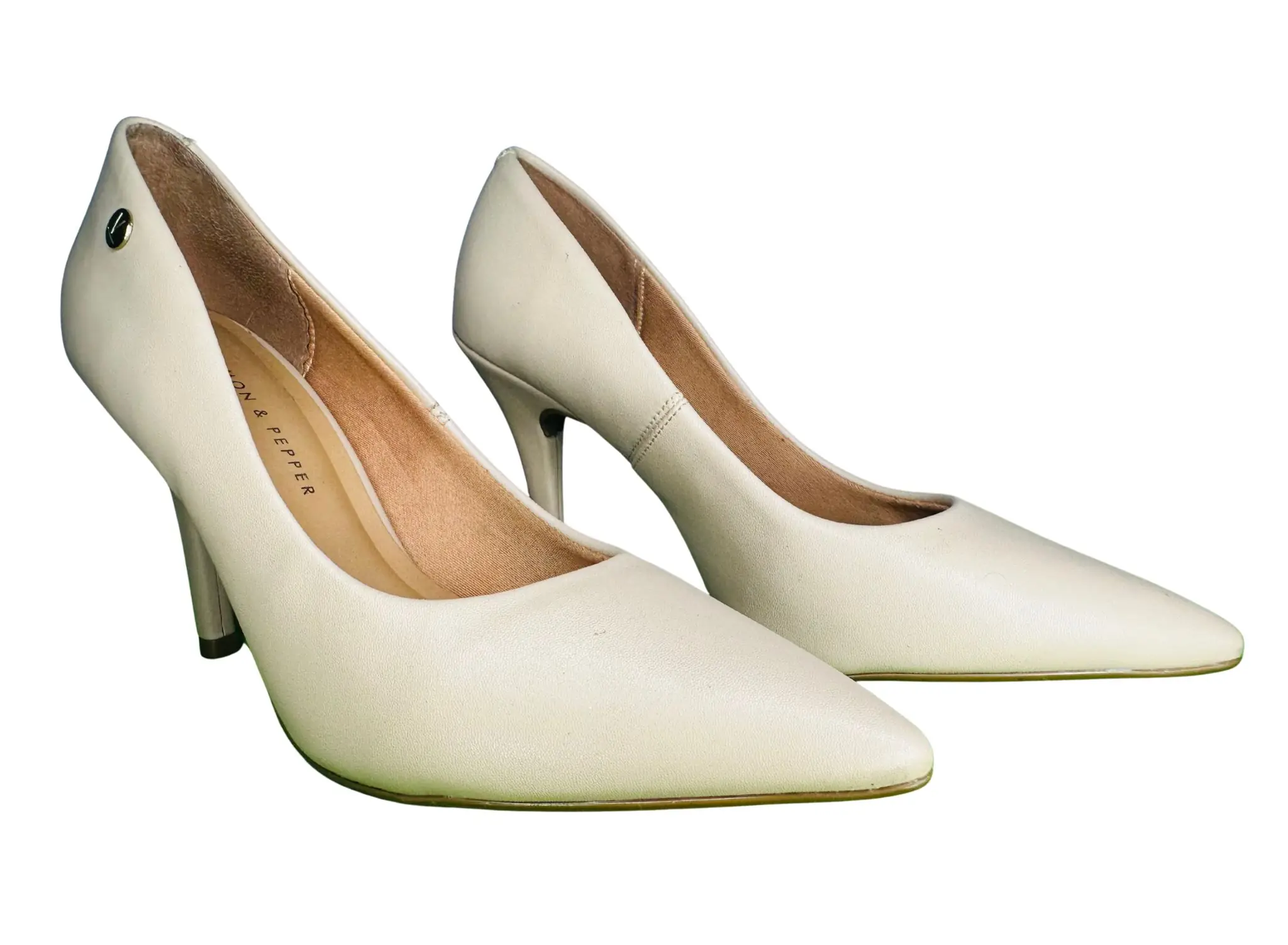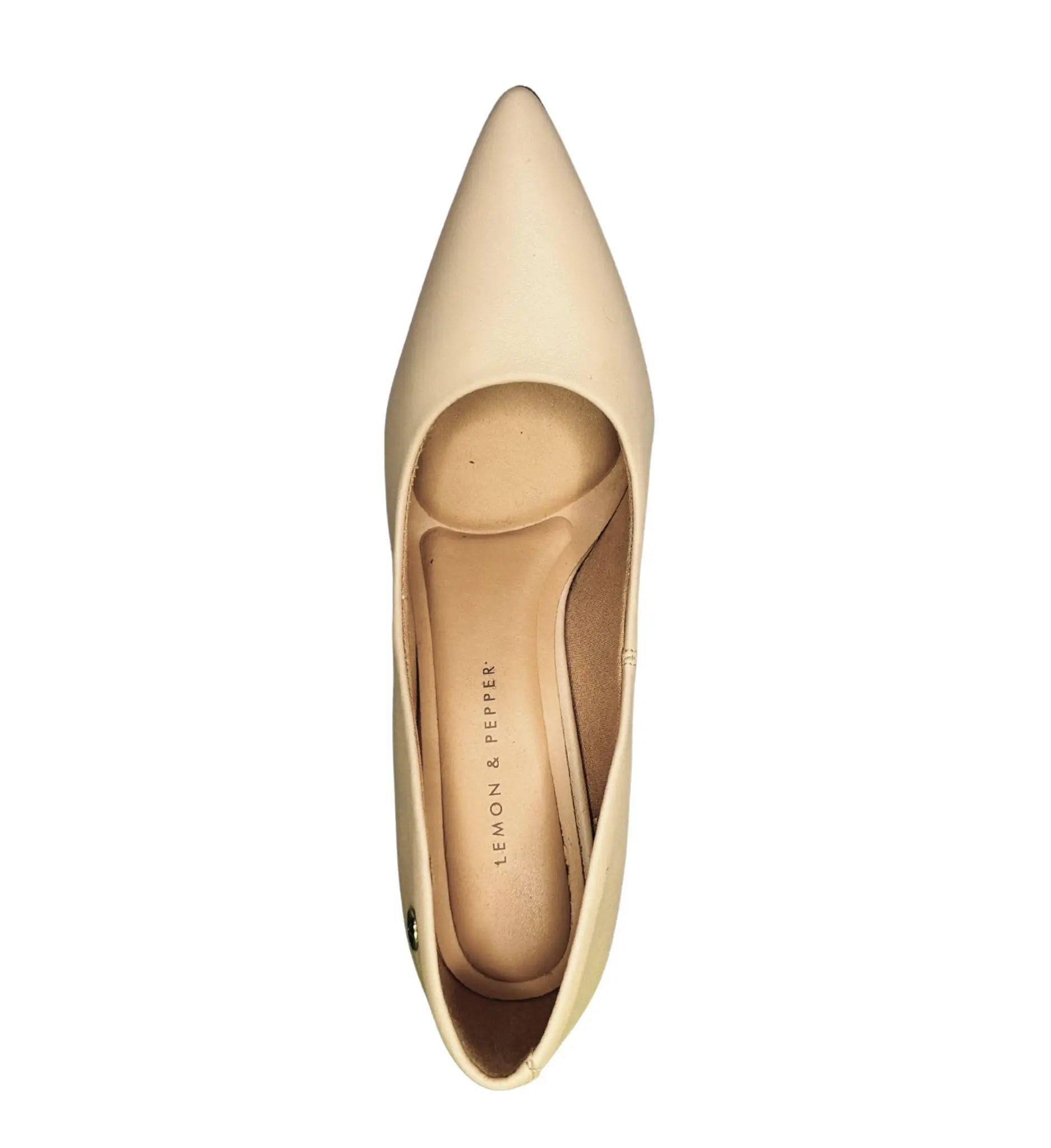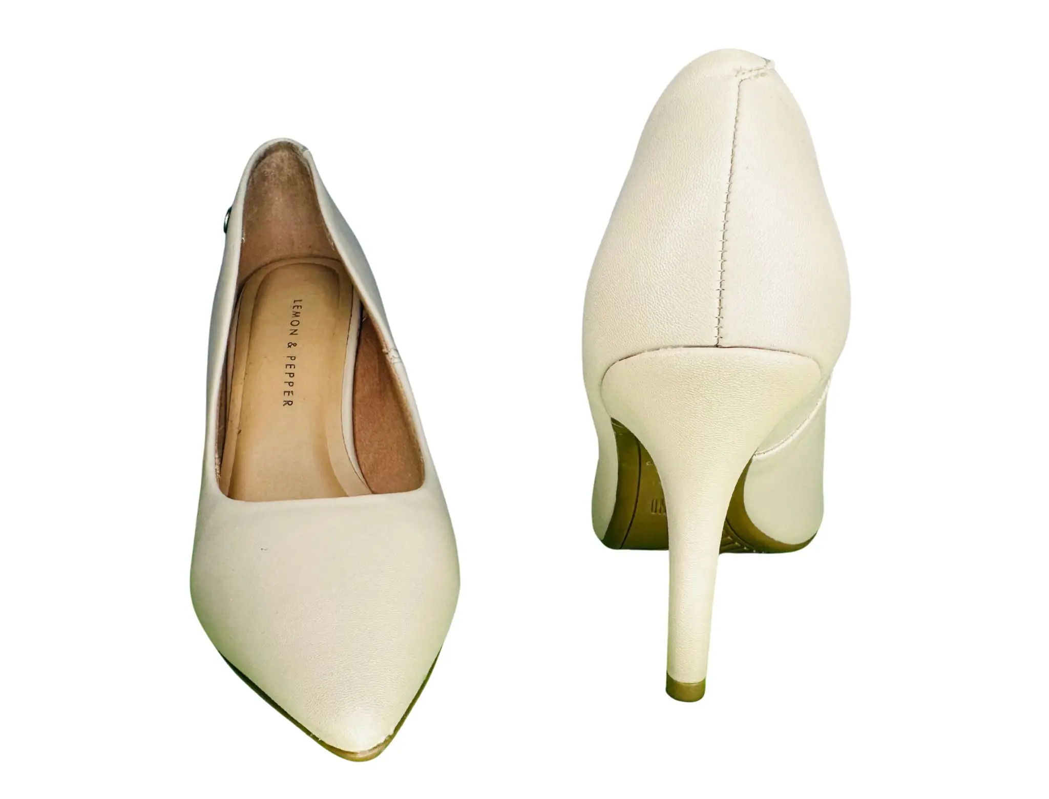 Elevate your look with these elegant cream-colored stilettos by Lemon & Pepper. With a sleek pointed toe and a tall heel, these heels are perfect for parties, formal occasions, or evening outings. The neutral shade complements both ethnic and western wear.